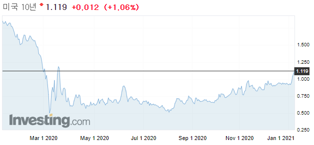 최근 10년 만기 미국 국채금리는 1.1%까지 상승했다.