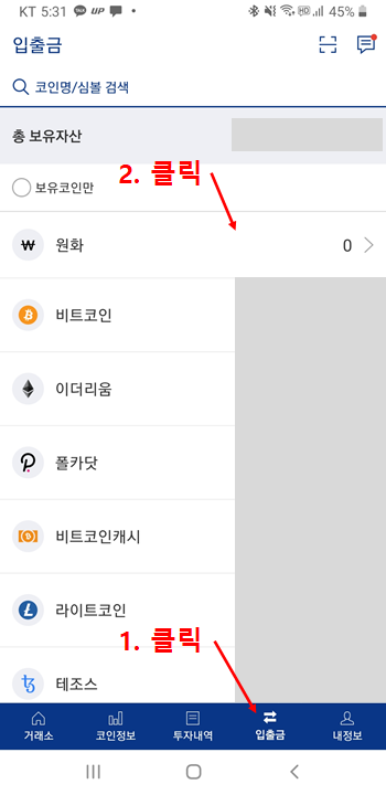 먼저 상단의 입출금 탭을 들어가서 원화를 클릭합니다.