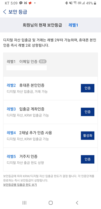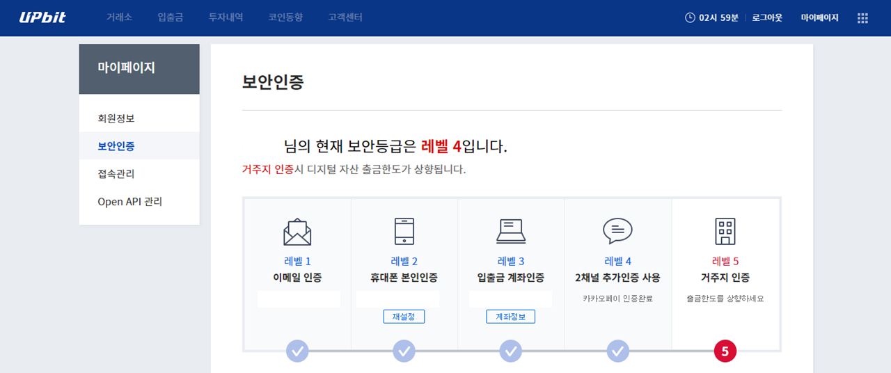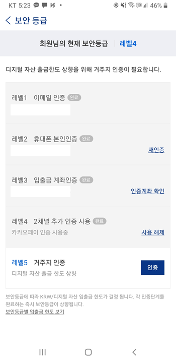 레벨5는 디지털 자산 출금 한도를 상향시키고 싶다면 하면됩니다.
