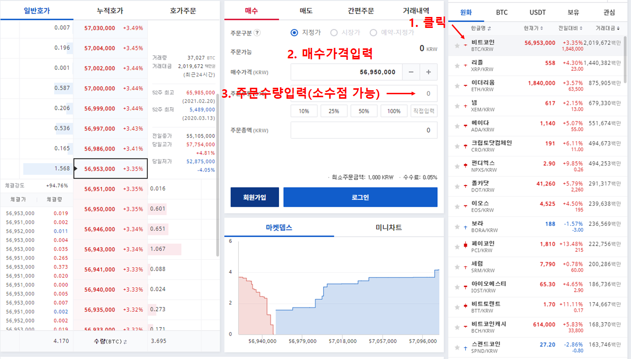 우선 원하는 암호화폐를 클릭 후 매수가격대를 입력합니다.
