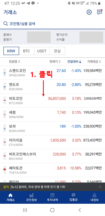 거래소 탭에서 거래하고자하는 가상화폐를 클릭합니다.