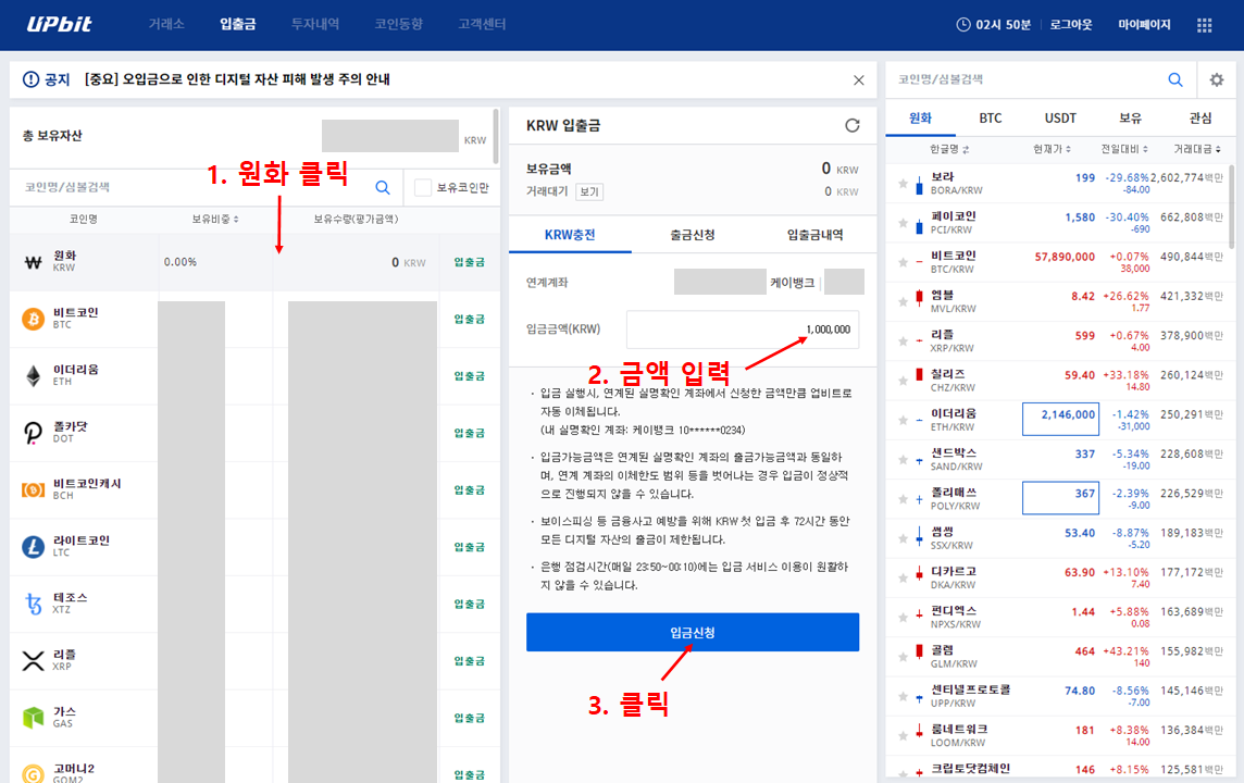 위에서도 말했듯이 업비트에 돈을 입금시키기 위해서는